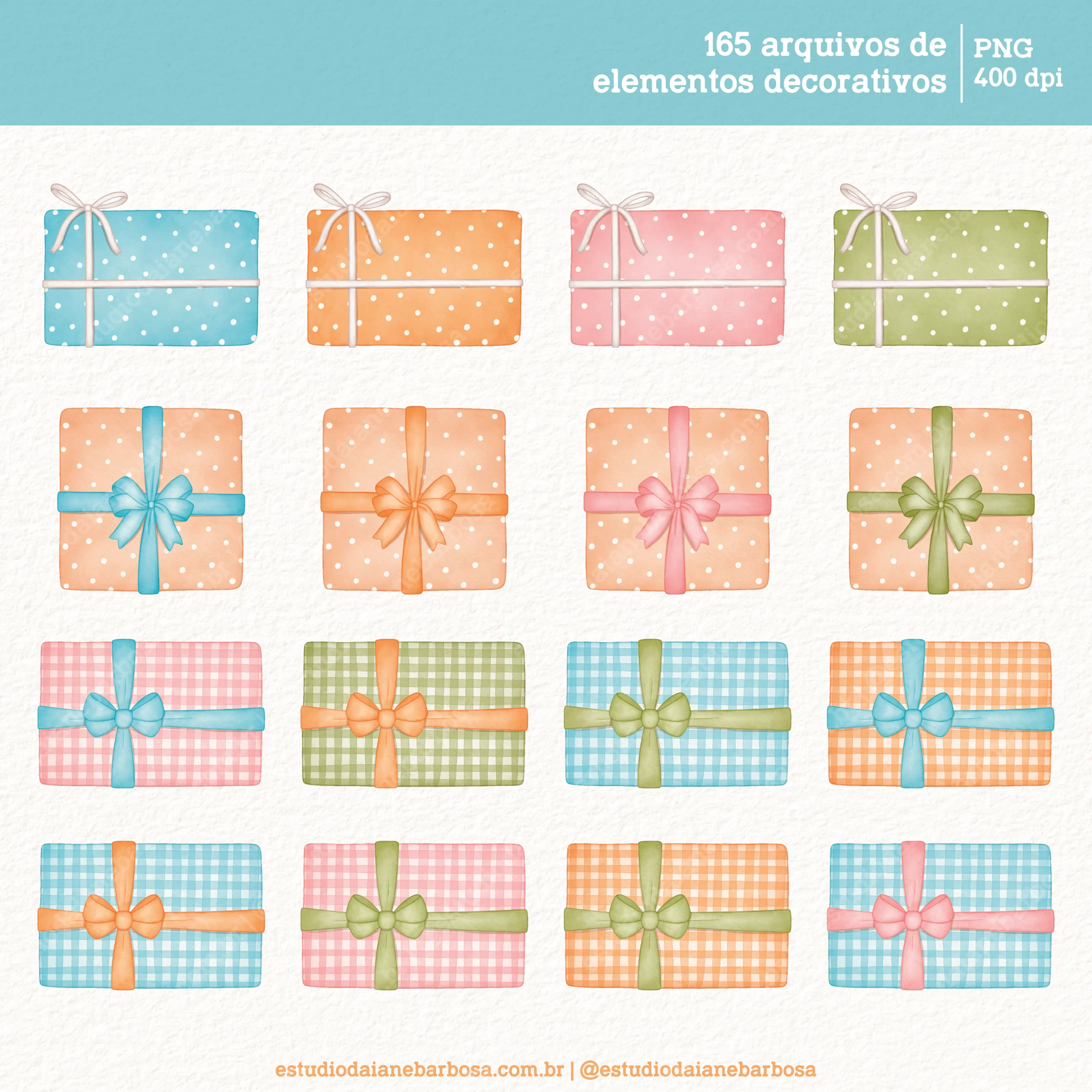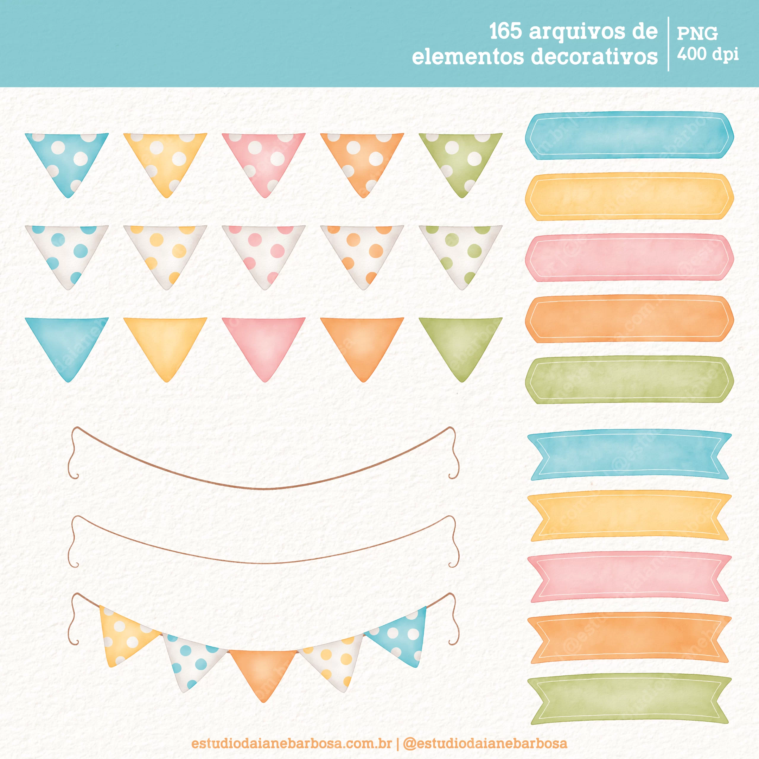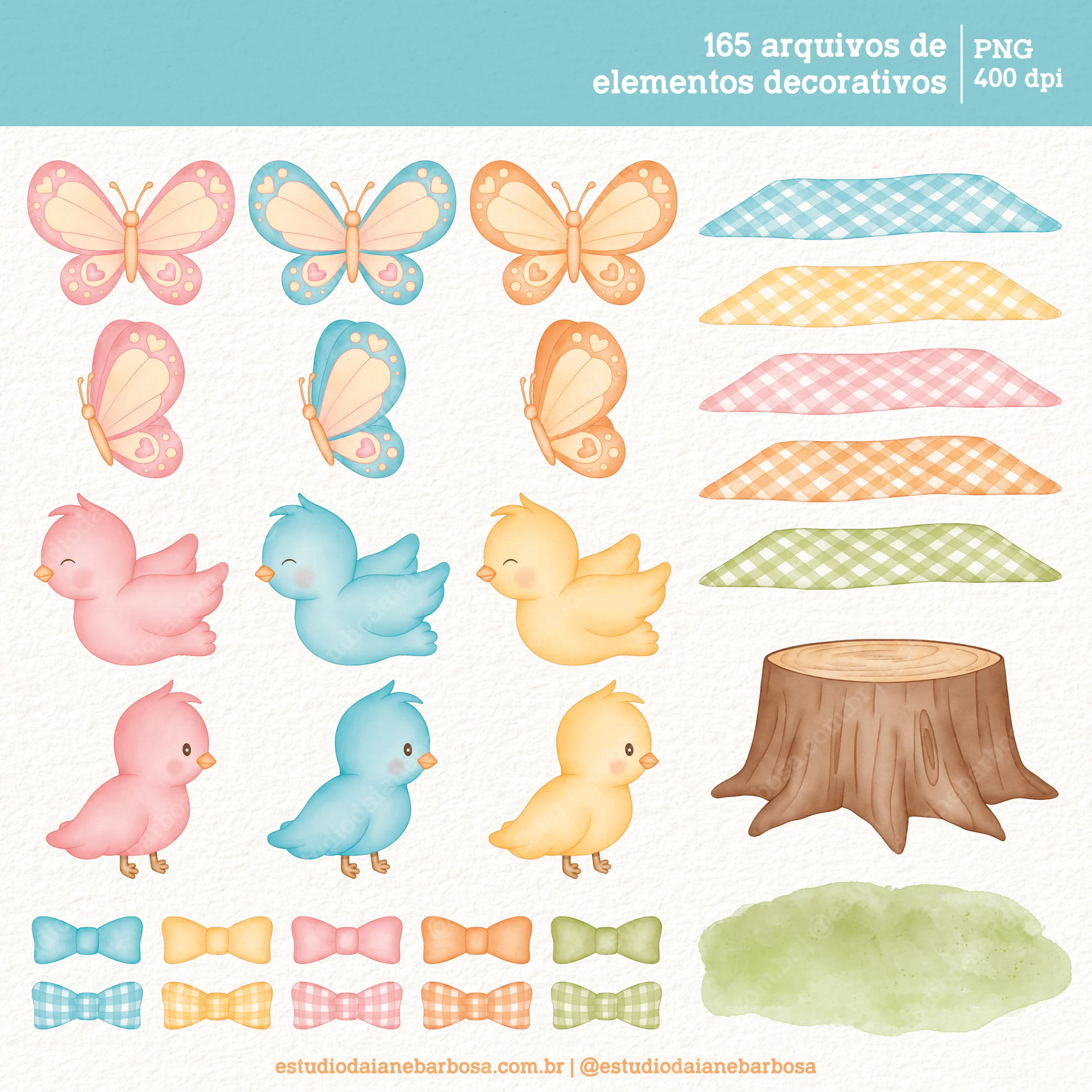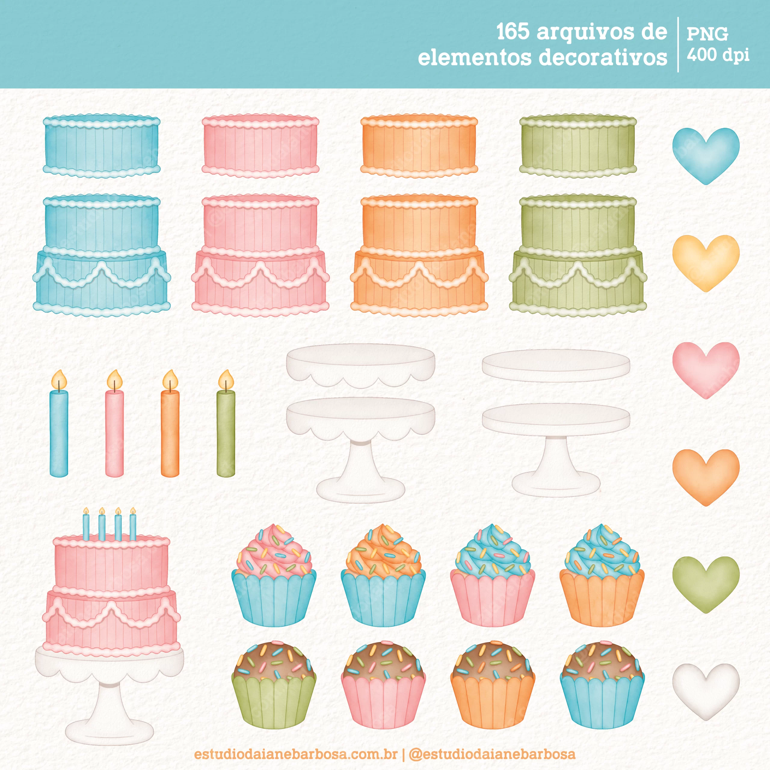 – 165 arquivos de elementos decorativos, incluindo bichinhos fofos, bolos, balões, bandeirolas, cupcakes, brigadeiros, presentes e muito mais!