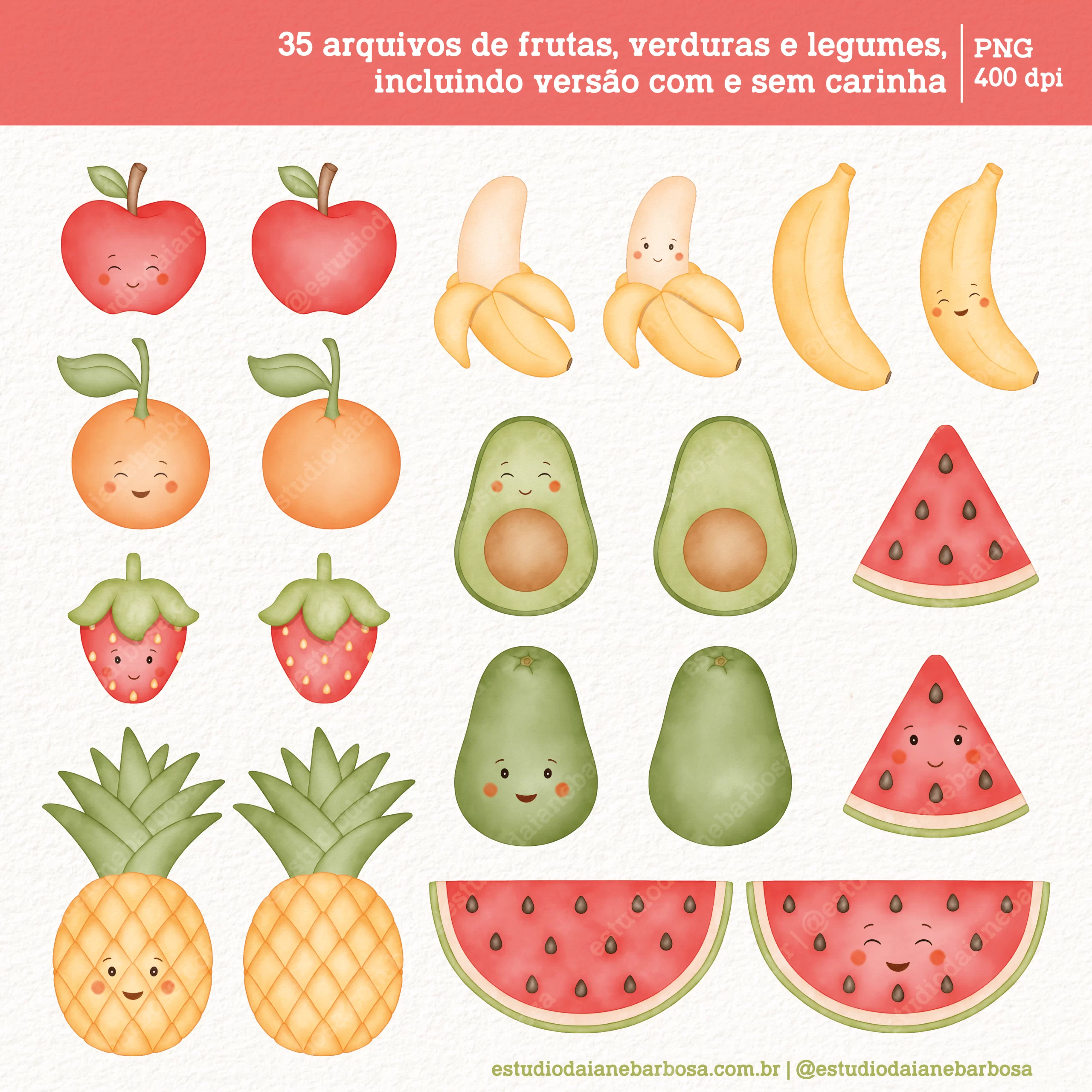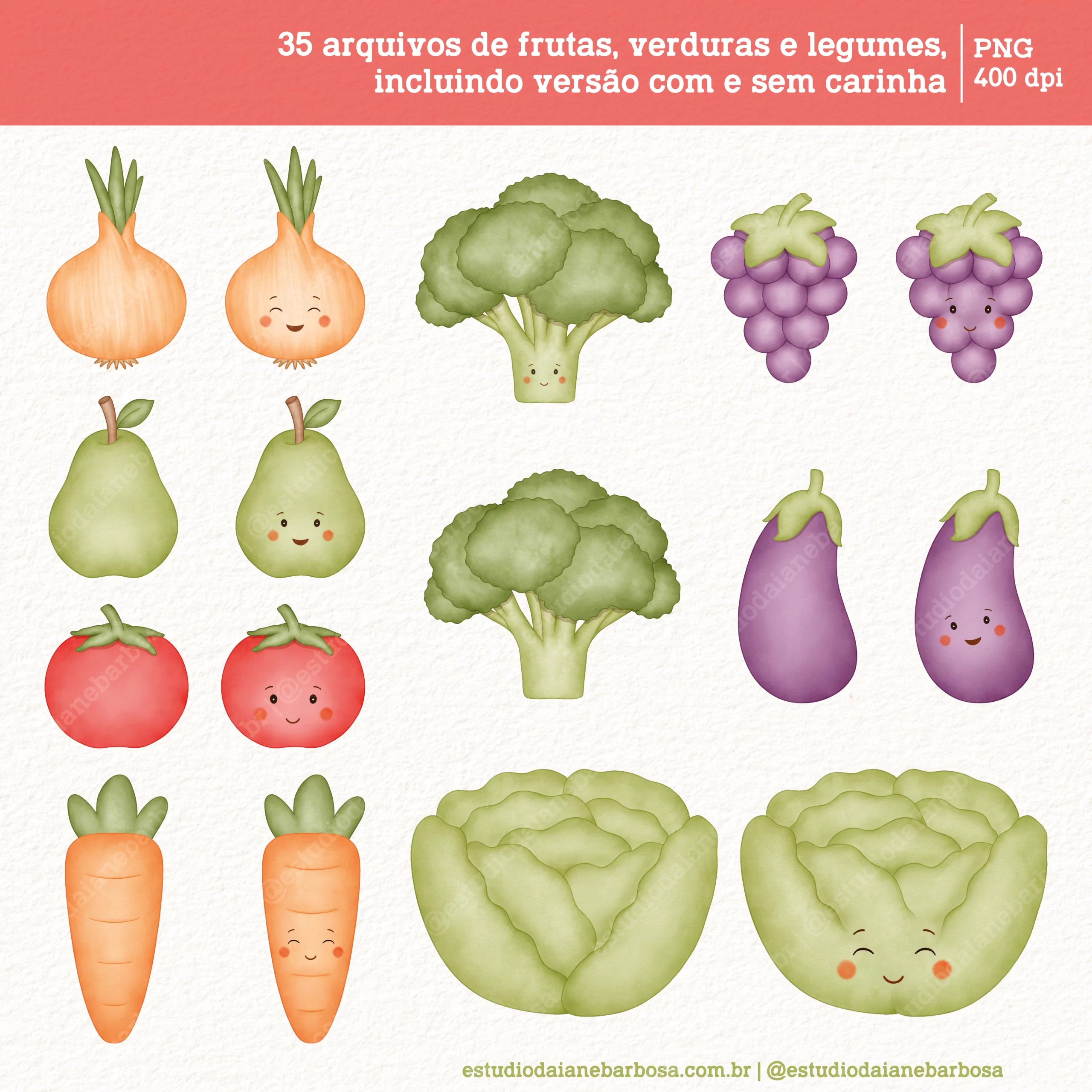 – 35 arquivos de frutas, verduras e legumes, incluindo versão com e sem carinha;