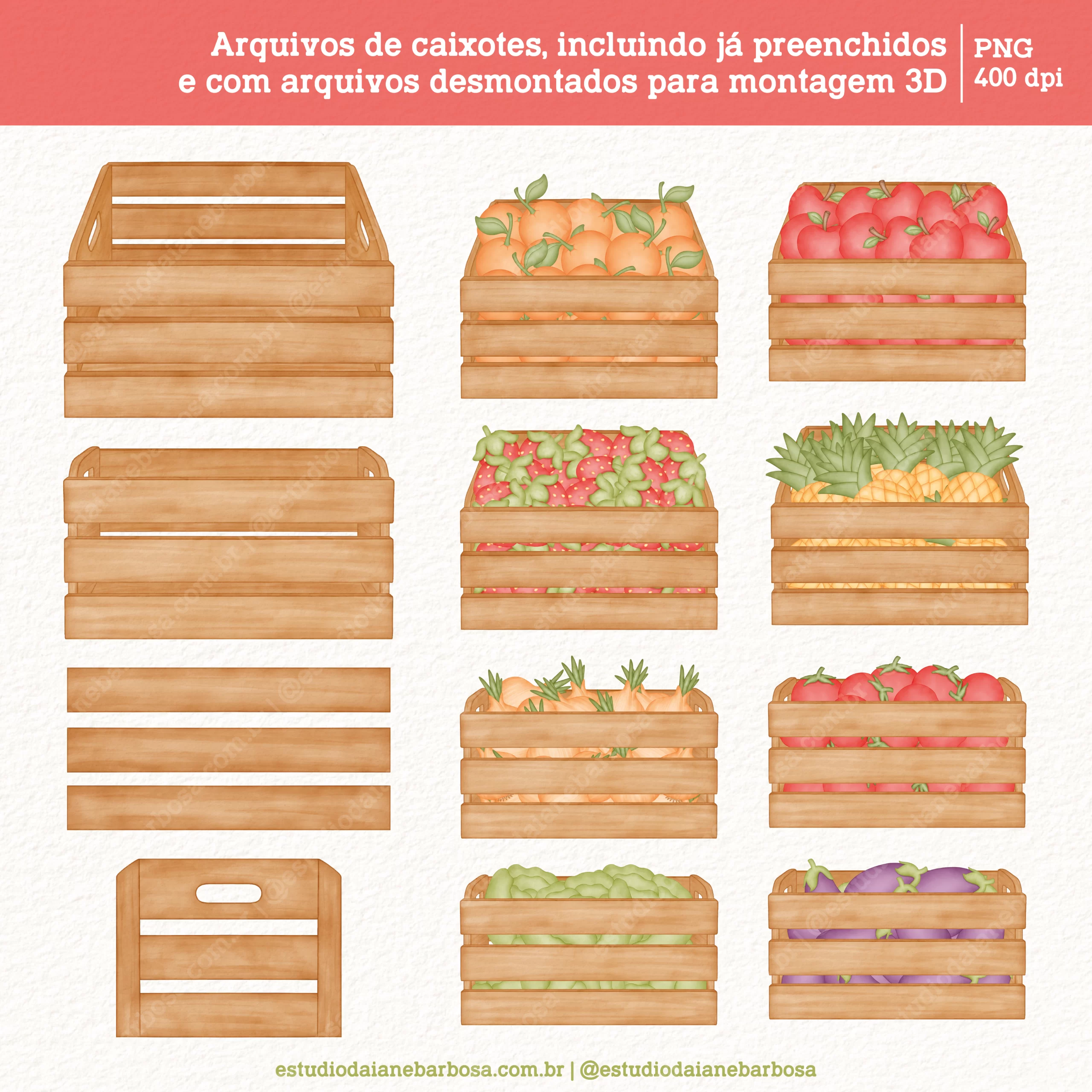 – Arquivos de caixotes, incluindo já preenchidos e com arquivos desmontados para montagem 3D;