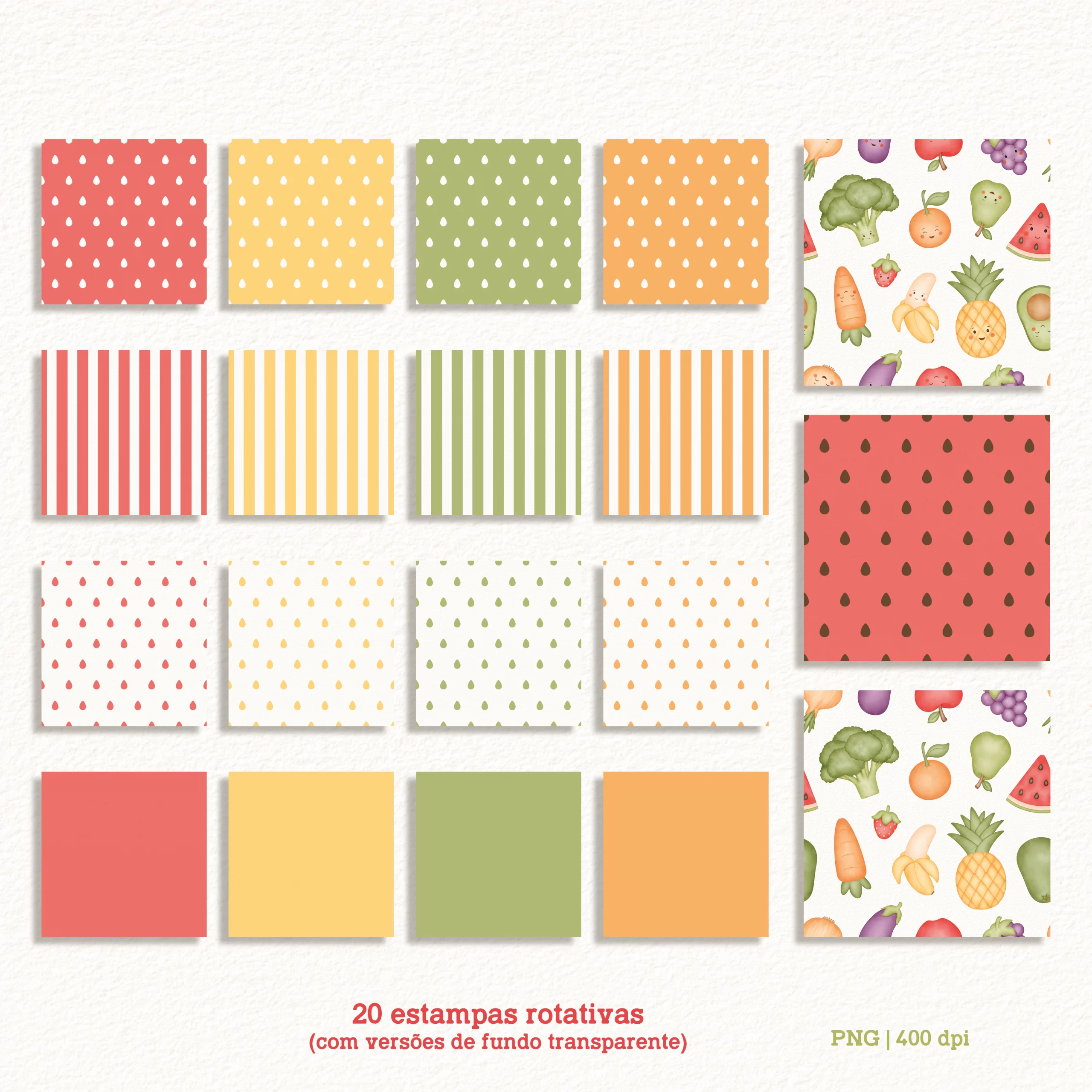 – 20 papéis digitais rotativos (incluindo as estampas com fundo transparente), com padronagens de laranjas, quadriculada, listras e xadrez;